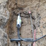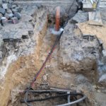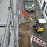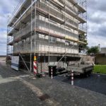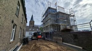 Wie schon der Einbau der neuen Kammer-Decke war auch die Installation und der Anschluss des HAKs, des sogenannten Hausanschlusskastens, ein erfreuliches Ereignis. Sind es doch erste sichtbare Zeichen des beginnenden Wiederaufbaus nach Monaten der Abriss- und Rückbauarbeiten. Zunächst sperrte das durch das Energieversorgungsunternehmen (EVU) beauftragte Tiefbauunternehmen gemäß straßenbaurechtlicher Genehmigung des Kreises Kleve den Fischerwall vollständig. Anschließend nahm es die Basaltsteinpflasterung auf und erstellte mittels Presslufthammer und Mini-Bagger ein Loch um das in der Straße verlaufende Stromkabel. Nach mehreren vergeblichen Versuchen gelang es letztendlich problemlos die Hausanschlussleitung durch das bereits vor dem Aufstellen des Baugerüsts verlegte Leerrohr bis ins Haus zu führen. Einige Tage danach erfolgte der Anschluss des HAKs sowie das Anmuffen der Hausanschlussleitung an das in der Straße verlaufende Kabel durch ein anderes Fachunternehmen. Ruck-zuck – fertig! Erneut einige Tage später verfüllte das Tiefbauunternehmen das ausgehobene Loch, verlegte die Pflasterung aus Basaltstein kunstvoll und hob die Straßensperrung zur Freude aller Nachbarn auf – als wäre nie etwas passiert. So soll’s sein!