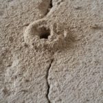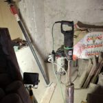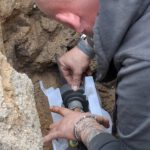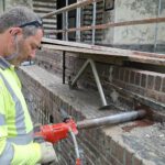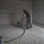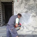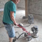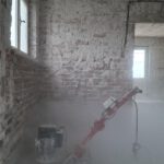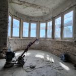 Dank einer weiteren das Sanierungsprojekt unterstützenden Fachfirma, Quarz Stein Thun (QST) aus Kleve, konnten die Reste des durch Wassereintrag massiv geschädigten und daher in Abstimmung mit dem Unteren und Oberen Denkmalamt manuell zurückgebauten Holzestrichs abgeschliffen werden. Die ist die Voraussetzung für den Einbau sämtlicher neuer und aufgearbeiteter Bodenbeläge. Durch das Abschleifen wurden (leider) feine Risse in den Bodenplatten im sogenannten Herren- und Damen-Zimmer, beide im Erdgeschoss des Hauses, sichtbar. In weiteren Schritten wurden diese Haarrisse nach Vorgabe der die Sanierung von Haus Haan fachkompetent unterstützenden Firma Gebrüder Gründemann alle 20 cm aufgebohrt, ausgeblasen und mit Epoxidharz verfüllt.