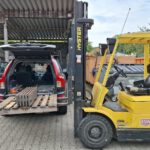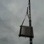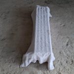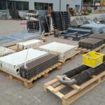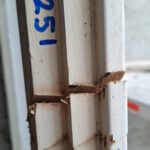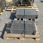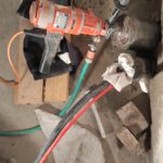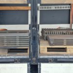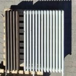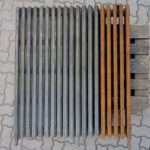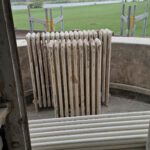 Nachdem Versuche die Heizkörper vor Ort mittels mobiler Strahltechnik mit verschiedenen Sandsorten, Metallkörnern und Eis zu entlacken fehlgeschlagen waren, wurde es erforderlich „die schweren Biester“ (max. 230 kg) außerhalb zu bearbeiten. Dazu war neben viel Muskelkraft auch der Einsatz des Krans erforderlich, da ein manueller Transport aus dem Obergeschoss über die marode Treppe unmöglich war. Da die Bemühungen zum Entlacken der Heizkörper auch in einer stationären Sandstrahlkabine fehlschlugen und nach Aussage des Fachunternehmers eine thermische Entlackung Schäden befürchten ließ, wurde das kleine abgebrochene Stück eines der Heizkörper probehalber zur chemischen Entlackung in die Niederlande verbracht. Das Ergebnis war hervorragend, bedauerlicherweise aber auch extrem teuer. Mittels eines sogenannten Nippel-Schlüssels, den uns dankenswerterweise der Sanitär- und Heizungsbau-Meisterbetrieb Claassen aus Kleve zur Verfügung stellte, konnte die gebrochene Rippe ab- und die beiden Reststücke wieder zusammen-genippelt werden. Wie schnell die gestrahlten Heizkörper wieder Rost ansetzen, ist eindrucksvoll auf den Fotos zu sehen.