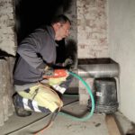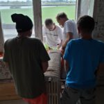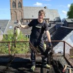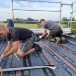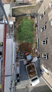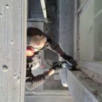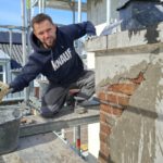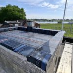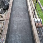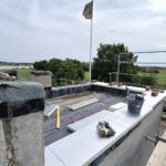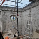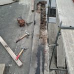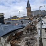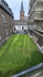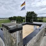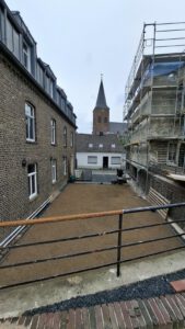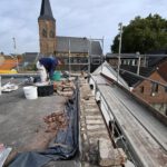 Breits im ersten Halbjahr konnte die erste neue Schicht Bitumenbahnen auf das große Flachdach aufgebracht werden, die an die vorhandene Attika angeklebt wurde. Während der Reinigung der Fassade wurden bedeutsame Risse sichtbar, die von den Wurzeln des vormals intensiven Bewuchses der Fassade mit Efeu verursacht wurden. Die ernüchternde Erkenntnis: mehrere Schichten des Mauerwerks der Attika mussten daher zurückgebaut werden. Anschließend musste das Wurzelwerk restlos entfernt werden bevor die Attika neu aufgemauert und neu verputzt wurde. Abschließend wurde Bitumen-Voranstrich aufgebracht, damit im Frühjahr 2026 die Dämmplatten sowie die zwei abschließenden Schichten Bitumenbahnen durch das Dachdecker-Meisterbetrieb Lippes Bedachungen GmbH verbaut werden können.