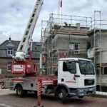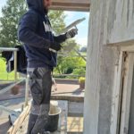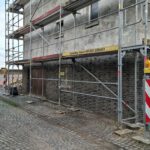 Ende des zweiten Quartals 2025 wurde Haus Haan vom Unternehmen Gerüstbau Peters aus Bedburg-Hau vollständig eingerüstet und seine Fassade mit Hilfe eines Höchstdruckreinigers (500 bar, bis zu 100 °C heißes Wasser), der von der Peter und Josef Janßen Malerbetrieb GmbH aus Kleve zur Verfügung gestellt wurde, gereinigt. Nach der fachmännischen Überprüfung der nun freiliegenden Oberfläche durch den öffentlich bestellten und vereidigten Sachverständigen für das Maler und Lackierer Handwerk, Olaf Kallweit aus Goch, folgte seine ernüchternde Einschätzung: „Die Wände müsst Ihr auch noch abschleifen!“. Grund hierfür war die Tatsache, dass auf Teilbereichen die ursprüngliche Fassadenfarbe dem Wasserdruck widerstanden hatte. Abfallen würde sie daher sicherlich nicht, aber es bestand die Befürchtung von „Unverträglichkeiten“ zwischen neuen Materialien und alter Farbe. Da alles Jammern nichts nützt ging’s ans Werk. Nach dem Schleif-Marathon wurden etliche feine Risse im sehr harten Zementputz sichtbar. Diese wurden gewässert, verfüllt und geglättet. So präpariert sollte die Fassade den Winter unbeschadet überstehen und freut sich auf den Abschluss ihrer Sanierung im Frühjahr 2026.