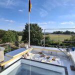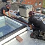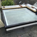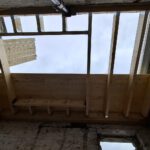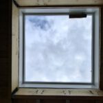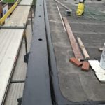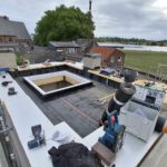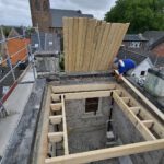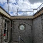 Nachdem der das Sanierungsprojekt unterstützende Statiker Neinhuis Bedenken bzgl. der Stabilität der Decke oberhalb der sogenannten Kammer geäußert hatte, fiel in Abstimmung mit der Unteren Denkmalbehörde die Entscheidung diese zurückzubauen – was das weitere Vorgehen nicht vereinfachte. Nach intensiven Abwägungen der Möglichkeiten wurde der Entschluss gefasst die Decke durch eine Balkenkonstruktion zu ersetzen. Dazu mussten zunächst die Moniereisen entfernt werden und die Reste der vormaligen Betondecke lotrecht zu den vier Wänden entfernt werden. Dann wurde der Rahmen des Dachstuhls mittels Gewindestangen, die in den Rest der Betondecke, nun eher ein Betonrähm, eingebohrt und -geklebt wurden, befestigt. Nachdem die Sparren, die den vorgesehenen Einbau eines großen planen Dachflächenfensters berücksichtigten, montiert waren wurden die Rauspundbretter als Grundlage für den weiteren Dachaufbau verschraubt. Um nach Wochen „oben ohne“ wieder dicht zu sein wurde umgehend die erste Lage Bitumenbahnen aufgebracht. Es folge der zeitaufwändige Zuschnitt der Dämmplatten auf der Attika der Kammer sowie deren Montage. Nachdem nun endlich wieder alles dicht war, schnitten die Dachdecker zum anstehenden Einbau des VELUX-Dachflächenfensters ein 151 x 151 cm großes Loch in die bis dato dichte Dachfläche. Nach seiner Montage konnte die nicht weniger detailreiche Installation der Dämmplatten auf der kleinen Dachfläche sowie auf der Innenseite der Attika erfolgen. Last but not least verklebten die Mitarbeiter des Dachdecker-Meisterbetriebs Lippes Bedachungen GmbH die abschließenden zwei Lagen Bitumenbahnen. Nun fehlt zur endgültigen Fertigstellung dieses Daches lediglich der Zuschnitt der zzt. noch überstehenden Dämmung auf der Attika, die Installation der Blechabdeckung sowie der dauerhaft regendichte Verschluss der beiden Kamine, deren Putz zuvor noch saniert werden muss.
