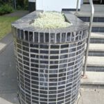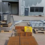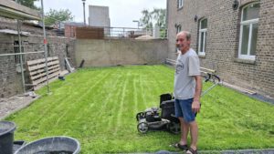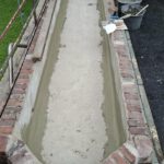 Auch die bedauerlicherweise erforderliche Sanierung des bauzeitlichen und für die Epoche Neues Bauen stilistisch exemplarischen Hochbeets vor Haus Haan dauert schon eine Weile an (vgl. I/2025). Gartenseitig wurden an beiden Enden des Hochbeetes 50-ger Kernbohrungen erstellt in die Ausflussrohre aus Edelstahl eingebaut wurden. Anschließend wurden alle Kanten des Hochbeets mit einem Dichtband versehen und anschließend auf die Innenseiten ein durckwasserdichtes flüssige Beschichtung aufgetragen. Somit fehlt nun nur noch eine dauerhafte Bepflanzung. Ein sehr ähnliches Hochbeet gibt es vor dem Museum Chabot in Rotterdam. Auch hier befindet sich das Hochbeet links vor der Haustür, beginnt mit einem Halbrund und ist aus Ziegelsteinen errichtet.